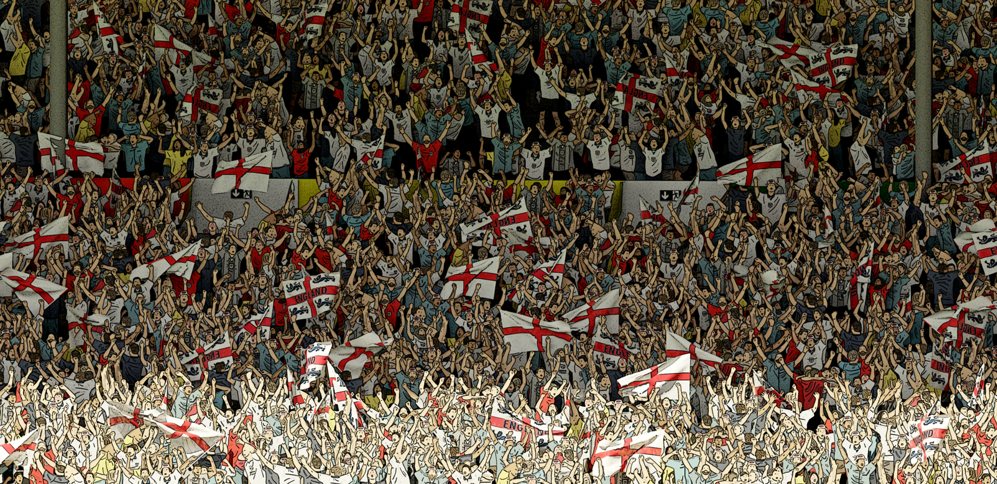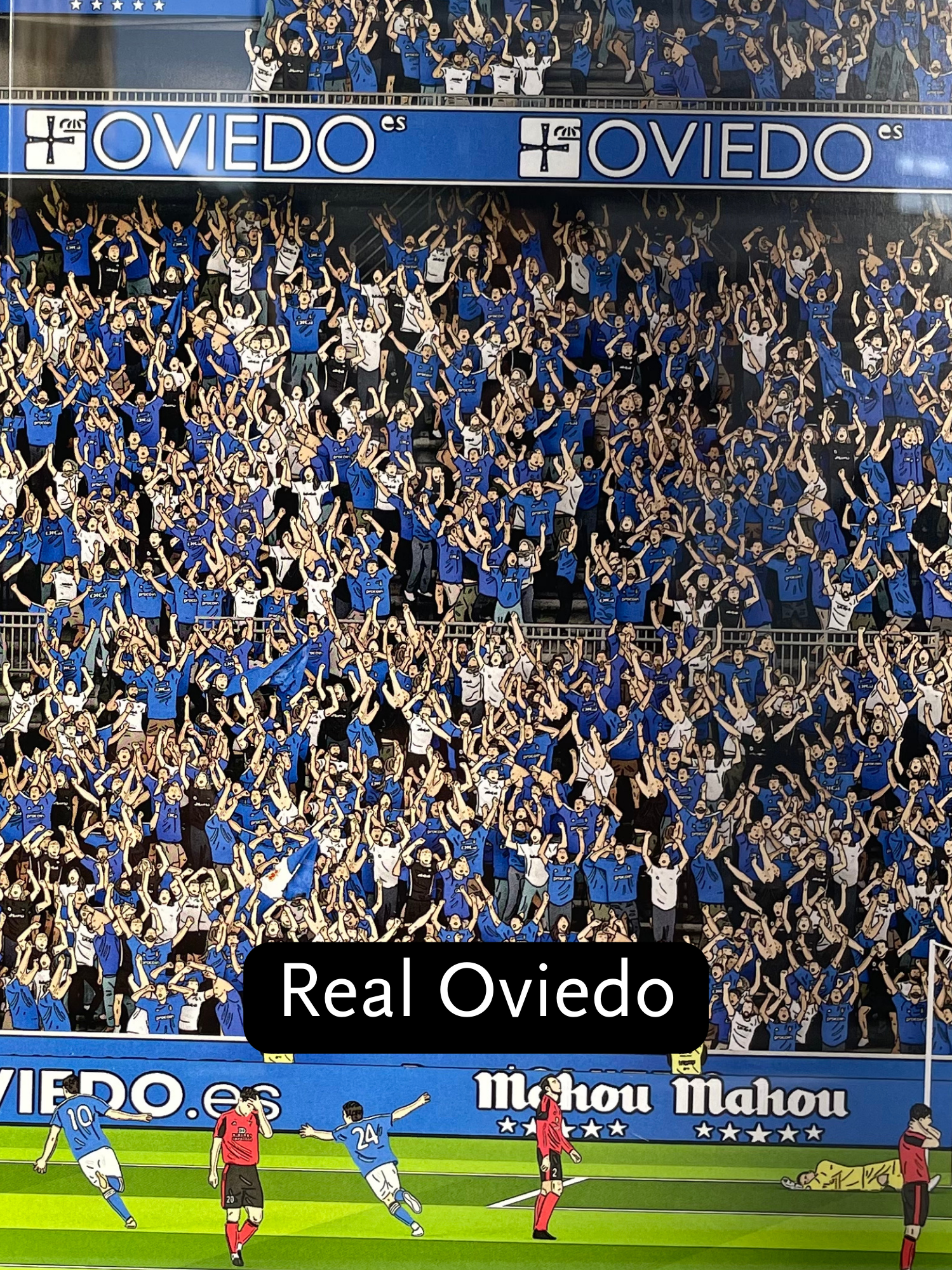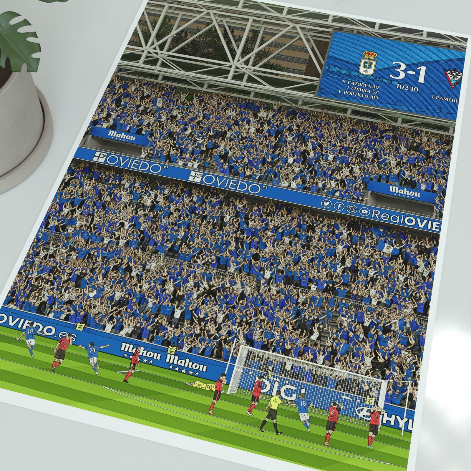 Una ilustración que inmortaliza la euforia del tercer gol del Real Oviedo en el partido decisivo por el ascenso a Primera División, tras más de dos décadas de ausencia.