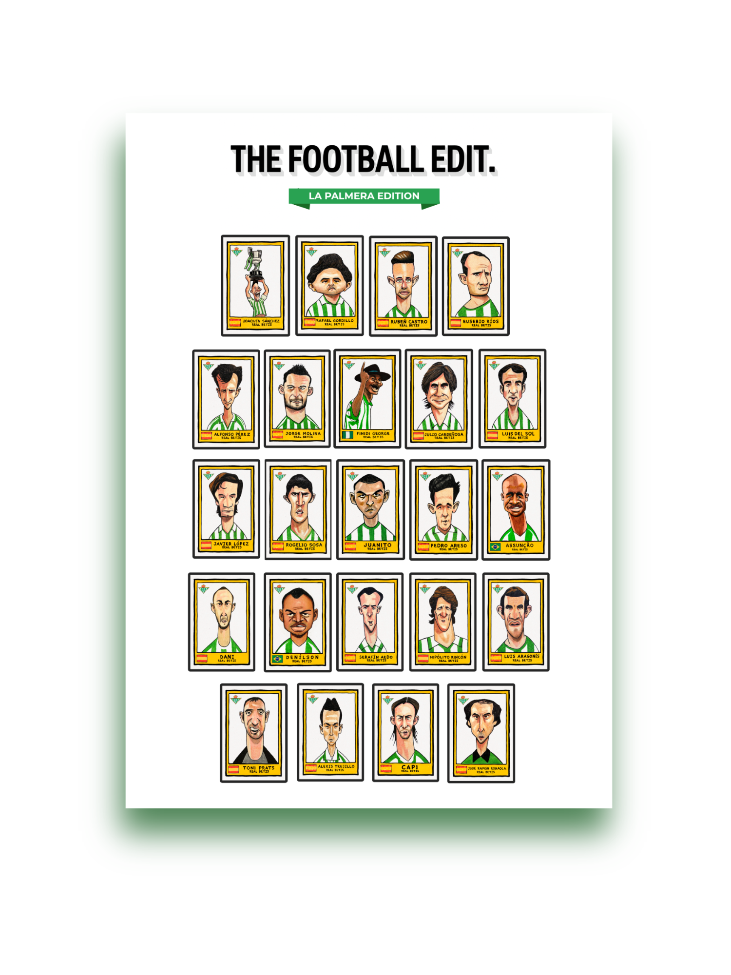 Una lámina A3 repleta de cromos estilo Panini “wonky”, imperfectos, divertidos, nostálgicos… y 100% verdiblancos.